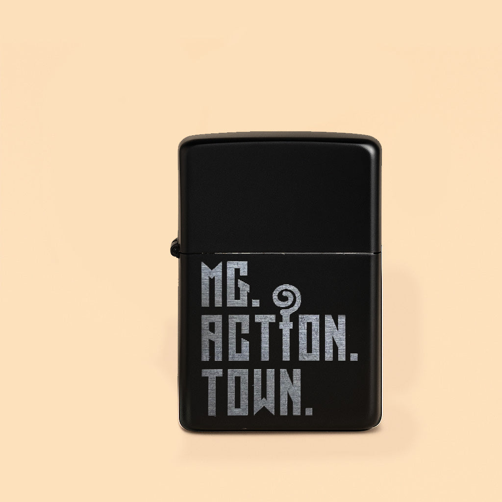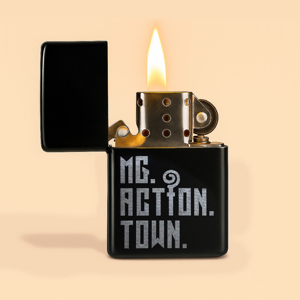 Benzinfeuerzeug „MG.ACTION.TOWN“ – Feuer mit Haltung