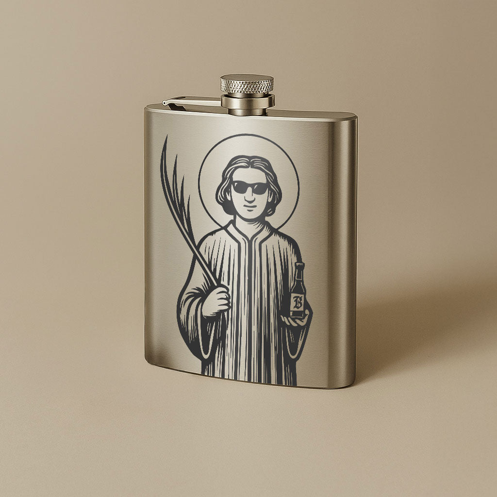 Tradition trifft Trinkkultur: Dieser stilvolle Flachmann zeigt den heiligen St. Vitus – nicht in sakraler Pose, sondern mit einem Bier in der Hand. Ein Motiv, das zwischen Legende und Lebenslust pendelt – graviert auf Edelstahl, robust und elegant zugleich.